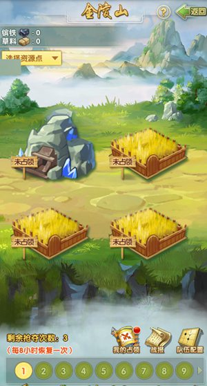 配合蓄馬場(chǎng)的出現(xiàn),金陵山的相關(guān)玩法也開啟了。游戲中,掌門可在金陵山中通過占領(lǐng)資源點(diǎn)獲取資源,而資源點(diǎn)分為鐵礦場(chǎng)和草料場(chǎng)兩種,鐵礦場(chǎng)生產(chǎn)鑌鐵,草料場(chǎng)生產(chǎn)草料。需要注意的是,每個(gè)弟子最多只能占領(lǐng)兩個(gè)資源點(diǎn),搶奪和防守都會(huì)以隊(duì)伍為單位進(jìn)行,掌門需要合理分配隊(duì)伍,一個(gè)隊(duì)伍最多放置3名弟子。