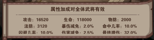 圣物:也是不需要等級就開放的,分別有橙色與紅色品質(zhì)的圣物,每個圣物的屬性都不一樣,有經(jīng)驗加成的(如洛神賦、太平要術(shù))、有武將提示傷害(諸葛連弩)、有減傷的(昊天塔)等等;每個圣物也有不一樣的被動屬性,也有圣物共鳴加成;另外圣物屬性也是對全體武將生效;