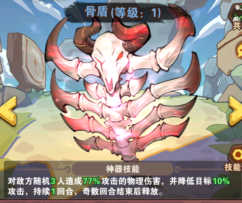 骨盾:對敵方隨機3人造成77%攻擊的物理傷害,并降低目標10%攻擊,持續(xù)1回合,奇數(shù)回合結(jié)束后釋放。