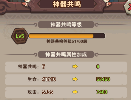 神器可通過強化提升等級,這邊建議是要平均升每一個神器的等級,有共鳴等級屬性加成的,而且也能增加每一個神器的屬性傷害。