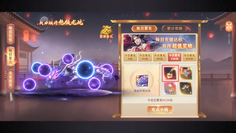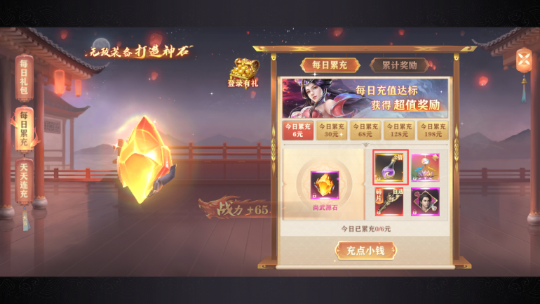 每日小充6元就可以獲得1個(gè)2倍的經(jīng)驗(yàn)藥水,有錢的可以搞到128元的,再拿1個(gè)3倍的經(jīng)驗(yàn)藥水。