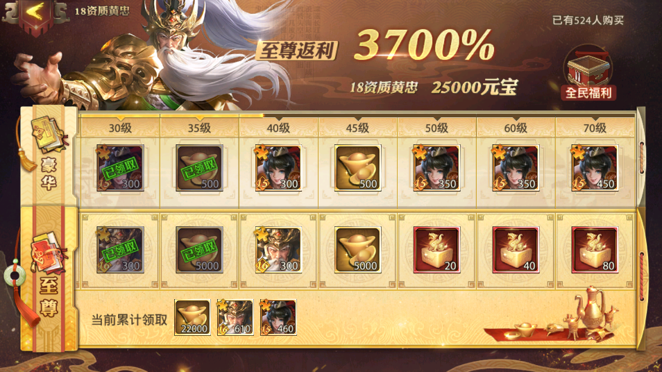 后排英雄玩家可以通過游戲內(nèi)免費(fèi)贈(zèng)送的高級(jí)求賢令抽去16資質(zhì)武將去補(bǔ)齊后排缺失的輸出。這邊推薦玩家可以購(gòu)買6星黃忠獲得獲得16資質(zhì)黃忠,玩家購(gòu)買后通過16資質(zhì)黃忠活動(dòng)可以獲得弓神印,在晉升臺(tái)可以將黃忠晉升為18資質(zhì)紅將黃忠。