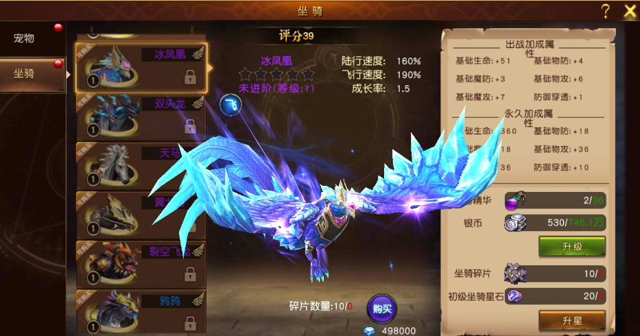 坐騎:每只坐騎都會為玩家?guī)砩?、物防、魔防、物攻、攻、防御穿透的屬性提升,坐騎品質(zhì)越高,提升越大。玩家可通過坐騎的升級以及升星來提升坐騎的屬性。