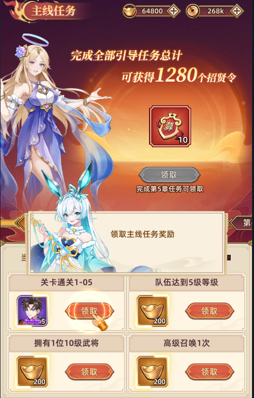 四、完成主線全部引導任務,總計可獲得1280招賢令和大量元寶等福利哦!