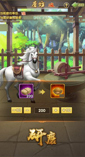 磨房是資源型建筑,掌門可在磨房中將草料研磨成飼料供養(yǎng)坐騎。升級磨房,可提高研磨的轉(zhuǎn)換率,使得草料研磨成更多的飼料。鑄幣廠也是資源型建筑,掌門可在鑄幣廠中將鑌鐵鑄造成相馬幣,在馬市中使用。同樣,升級鑄幣廠可提高鑄造轉(zhuǎn)換率,使得單位鑌鐵鑄造成更多的相馬幣。