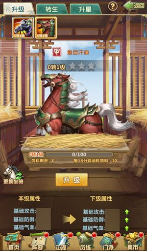 余下兩個功能型建筑分別是馬市和馬廄,掌門可在馬市中使用相馬幣兌換坐騎。升級馬市可開啟馬市欄位,刷新出更多的物品。而馬廄則能夠進行坐騎的升級,掌門升級馬廄,可提升單位飼料提升的坐騎經(jīng)驗值量。