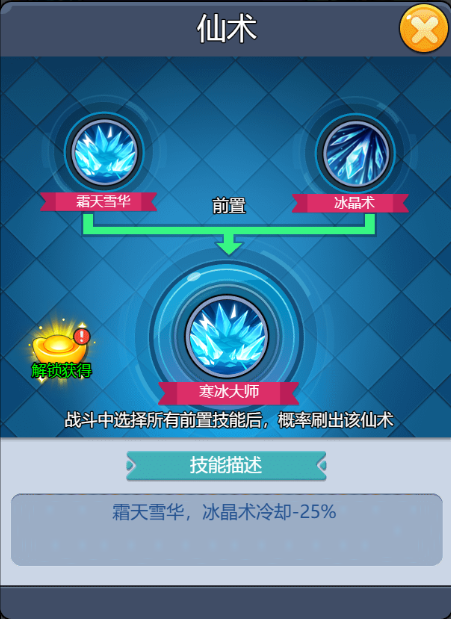 技能介紹很簡單理解,命中怪物就可以凍結(jié),且合成路徑也比較簡單,只要解鎖冰晶術(shù)就有概率刷到。? ??