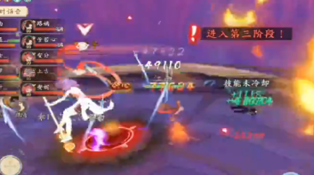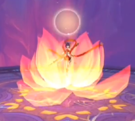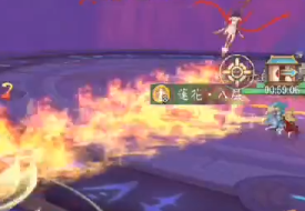 注:高傷AOE傷害,自身旋轉釋放一束連天火圈,狀態(tài)結束會有個插地結尾技能,此時,所有周圍玩家會被擊退??稍诨鹑磳⒔Y束時拉開距離?;鹑︶尫磐局?,可尋找攜帶蓮花之人,站在一起,降低所受傷害。