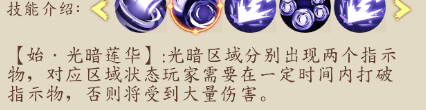 注:此技能其實就是BOSS攻擊類別,分陰陽,也就是光明與黑暗。黑暗為主攻擊傷害系。攻擊效果是光明與黑暗同時出現(xiàn),玩家躲避到白色【光明】光圈里時是安全的。在黑暗區(qū)域會損失一定血量。黑暗區(qū)域光圈也是雙圈重疊式,及時躲避即可。