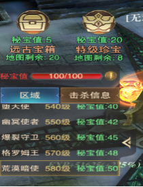 該BOSS玩法的進入副本后也是擁有100點秘寶值,也是該游戲魂器以及魂器材料產(chǎn)出的唯一途徑,激活魂器能給與角色很大的屬性加成,建議開啟該玩法后,每天都把次數(shù)刷完! 除BOSS以外,還有遠古寶箱和特級珍寶可供玩家采集,但采集寶箱也同樣需要消耗秘寶值,詳情可見下圖。且該副本的BOSS挑戰(zhàn)難度較高,擊殺會比較耗時。(PS:按照物品掉落的稀有程度,優(yōu)先級可以分為:副本BOSS≥特級珍寶>遠古寶箱)