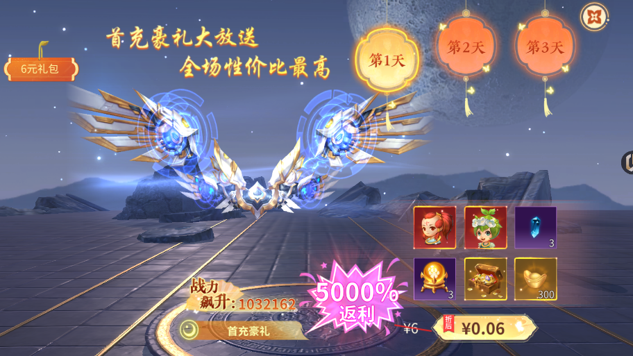1、首充送超絕神翼,首沖只需0.06!戰(zhàn)力直線飆升!